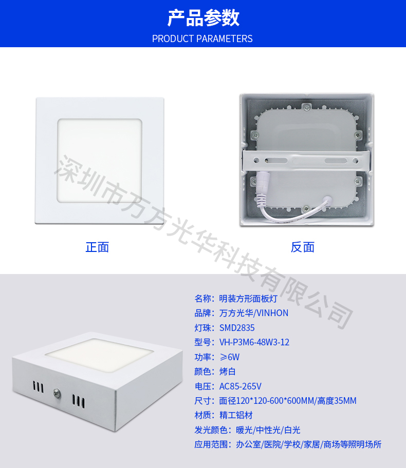 深圳市万方光华科技有限公司,专业研发、生产及销售LED灯管、面板灯、射灯、筒灯等工程照明LED灯,自有工厂,货期快,质量保证,目前已为全球数十万场所提供照明灯具及方案。面板灯系列里有集成吊顶面板灯、超薄圆形面板灯、方形小面板灯、明装面板灯、红外感应面板灯、雷达感应面板灯等,规格款式多样,可按照客户需求定制。