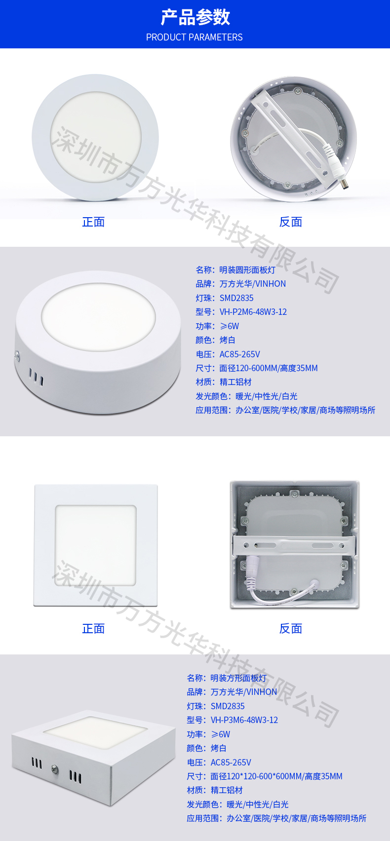 深圳市万方光华科技有限公司,专业研发、生产及销售LED灯管、面板灯、射灯、筒灯等工程照明LED灯,自有工厂,货期快,质量保证,目前已为全球数十万场所提供照明灯具及方案。面板灯系列里有集成吊顶面板灯、超薄圆形面板灯、方形小面板灯、明装面板灯、红外感应面板灯、雷达感应面板灯等,规格款式多样,可按照客户需求定制。