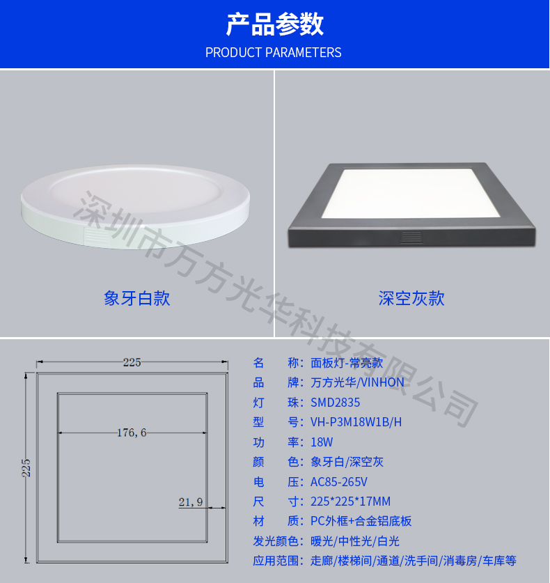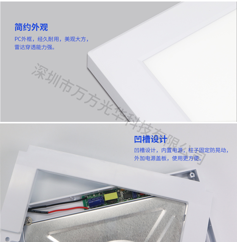 深圳市万方光华科技有限公司,专业研发、生产及销售LED灯管、面板灯、射灯、筒灯等工程照明LED灯,自有工厂,货期快,质量保证,目前已为全球数十万场所提供照明灯具及方案。面板灯系列里有集成吊顶面板灯、超薄圆形面板灯、方形小面板灯、明装面板灯、红外感应面板灯、雷达感应面板灯等,规格款式多样,可按照客户需求定制。