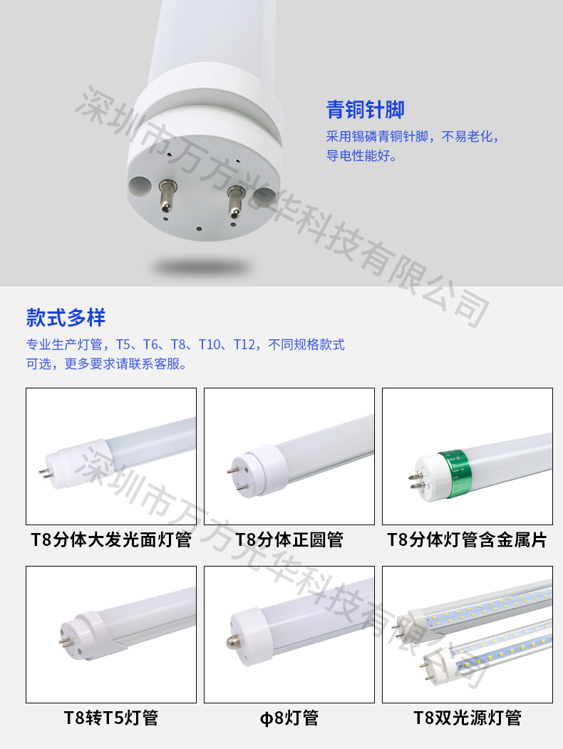 深圳市万方光华科技有限公司,专业研发、生产及销售LED灯管、面板灯,自有工厂,货期快,质量保证,目前已为全球数十万场所提供照明灯具及方案。灯管系列里有t5分体灯管、t5一体灯管、t5一体对接头灯管、t8分体灯管、t8一体灯管、t8转t5灯管、FA8灯管、双光源灯管、v型灯管、感应灯管等,规格款式多样,可按照客户需求定制。