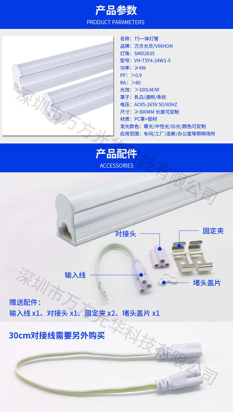深圳市万方光华科技有限公司,专业研发、生产及销售LED灯管、面板灯,自有工厂,货期快,质量保证,目前已为全球数十万场所提供照明灯具及方案。灯管系列里有t5分体灯管、t5一体灯管、t5一体对接头灯管、t8分体灯管、t8一体灯管、t8转t5灯管、FA8灯管、双光源灯管、v型灯管、感应灯管等,规格款式多样,可按照客户需求定制。