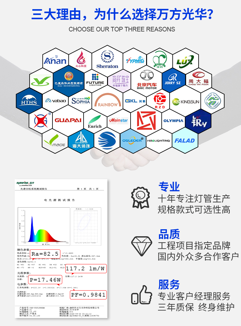 深圳市万方光华科技有限公司,专业研发、生产及销售LED灯管、面板灯,自有工厂,货期快,质量保证,目前已为全球数十万场所提供照明灯具及方案。灯管系列里有t5分体灯管、t5一体灯管、t5一体对接头灯管、t8分体灯管、t8一体灯管、t8转t5灯管、FA8灯管、双光源灯管、v型灯管、感应灯管等,规格款式多样,可按照客户需求定制。