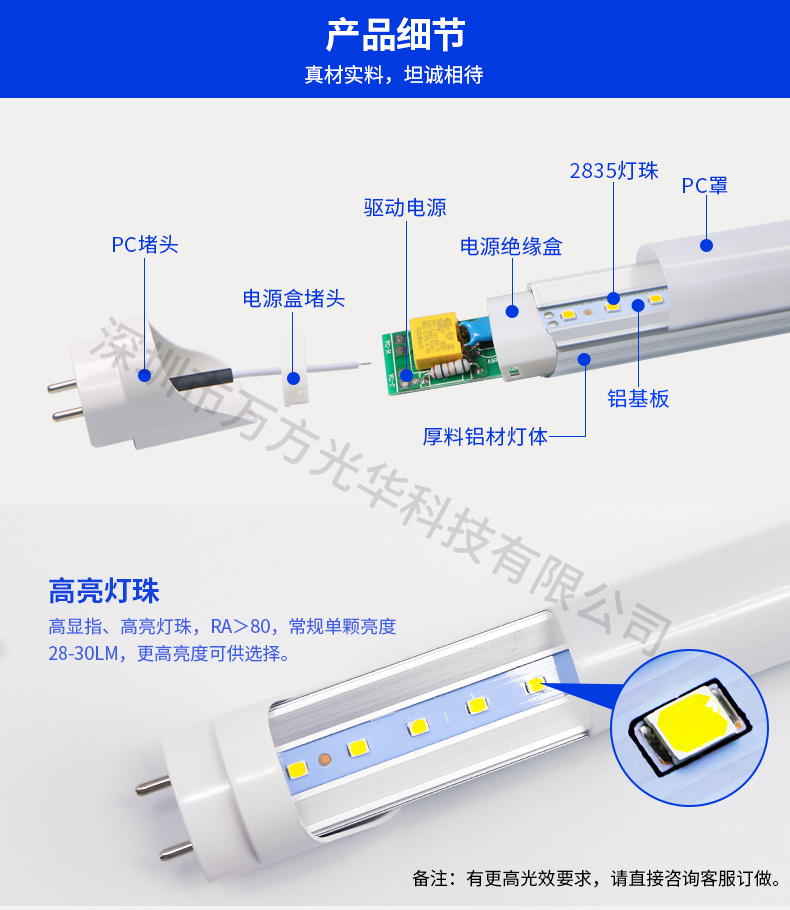 深圳市万方光华科技有限公司,专业研发、生产及销售LED灯管、面板灯,自有工厂,货期快,质量保证,目前已为全球数十万场所提供照明灯具及方案。灯管系列里有t5分体灯管、t5一体灯管、t5一体对接头灯管、t8分体灯管、t8一体灯管、t8转t5灯管、FA8灯管、双光源灯管、v型灯管、感应灯管等,规格款式多样,可按照客户需求定制。