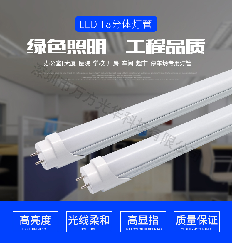 深圳市万方光华科技有限公司,专业研发、生产及销售LED灯管、面板灯,自有工厂,货期快,质量保证,目前已为全球数十万场所提供照明灯具及方案。灯管系列里有t5分体灯管、t5一体灯管、t5一体对接头灯管、t8分体灯管、t8一体灯管、t8转t5灯管、FA8灯管、双光源灯管、v型灯管、感应灯管等,规格款式多样,可按照客户需求定制。
