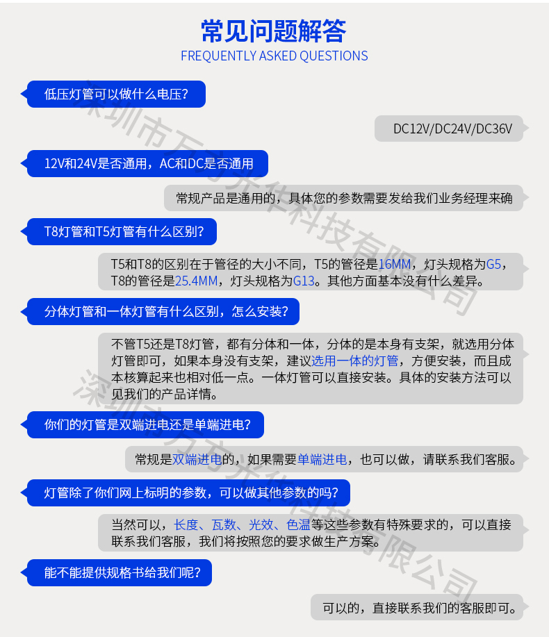 深圳市万方光华科技有限公司,专业研发、生产及销售LED灯管、面板灯,自有工厂,货期快,质量保证,目前已为全球数十万场所提供照明灯具及方案。灯管系列里有t5分体灯管、t5一体灯管、t5一体对接头灯管、t8分体灯管、t8一体灯管、t8转t5灯管、FA8灯管、双光源灯管、v型灯管、感应灯管等,规格款式多样,可按照客户需求定制。