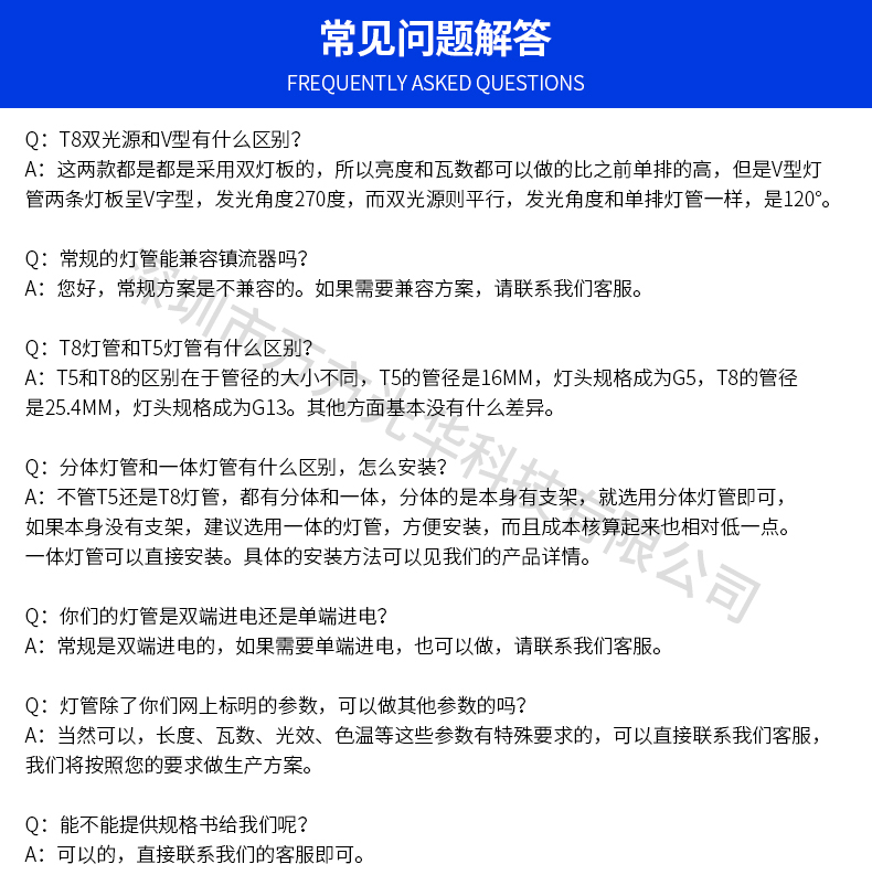 深圳市万方光华科技有限公司,专业研发、生产及销售LED灯管、面板灯,自有工厂,货期快,质量保证,目前已为全球数十万场所提供照明灯具及方案。灯管系列里有t5分体灯管、t5一体灯管、t5一体对接头灯管、t8分体灯管、t8一体灯管、t8转t5灯管、FA8灯管、双光源灯管、v型灯管、感应灯管等,规格款式多样,可按照客户需求定制。