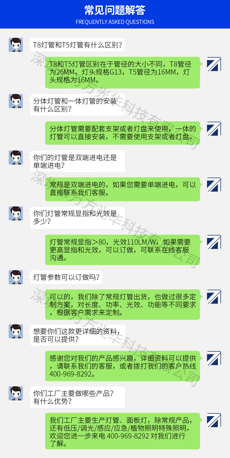 深圳市万方光华科技有限公司,专业研发、生产及销售LED灯管、面板灯,自有工厂,货期快,质量保证,目前已为全球数十万场所提供照明灯具及方案。灯管系列里有t5分体灯管、t5一体灯管、t5一体对接头灯管、t8分体灯管、t8一体灯管、t8转t5灯管、FA8灯管、双光源灯管、v型灯管、感应灯管等,规格款式多样,可按照客户需求定制。