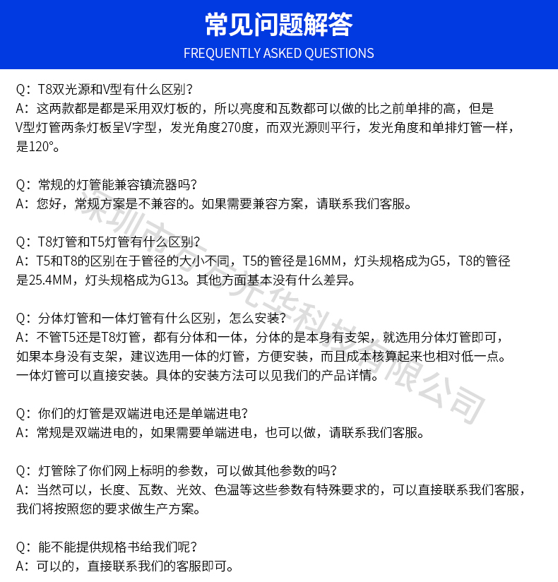 深圳市万方光华科技有限公司,专业研发、生产及销售LED灯管、面板灯,自有工厂,货期快,质量保证,目前已为全球数十万场所提供照明灯具及方案。灯管系列里有t5分体灯管、t5一体灯管、t5一体对接头灯管、t8分体灯管、t8一体灯管、t8转t5灯管、FA8灯管、双光源灯管、v型灯管、感应灯管等,规格款式多样,可按照客户需求定制。