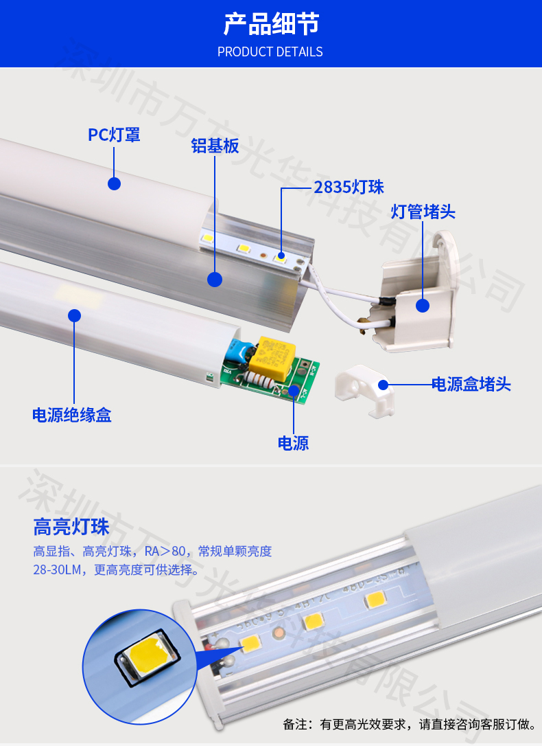 深圳市万方光华科技有限公司,专业研发、生产及销售LED灯管、面板灯,自有工厂,货期快,质量保证,目前已为全球数十万场所提供照明灯具及方案。灯管系列里有t5分体灯管、t5一体灯管、t5一体对接头灯管、t8分体灯管、t8一体灯管、t8转t5灯管、FA8灯管、双光源灯管、v型灯管、感应灯管等,规格款式多样,可按照客户需求定制。