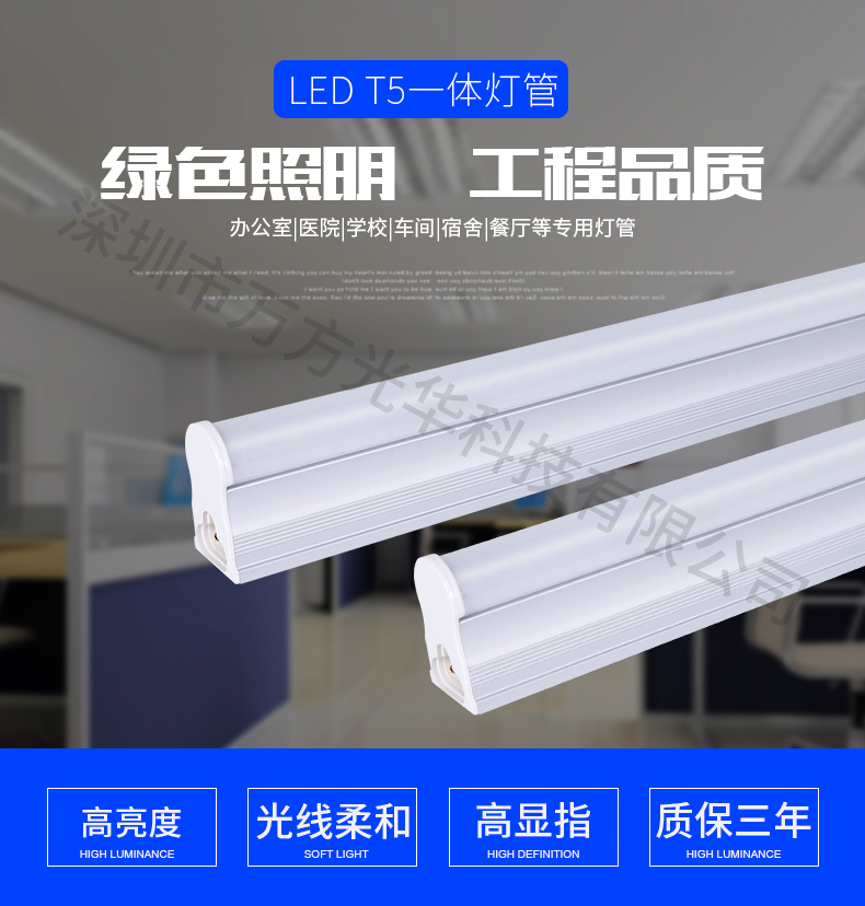 深圳市万方光华科技有限公司,专业研发、生产及销售LED灯管、面板灯,自有工厂,货期快,质量保证,目前已为全球数十万场所提供照明灯具及方案。灯管系列里有t5分体灯管、t5一体灯管、t5一体对接头灯管、t8分体灯管、t8一体灯管、t8转t5灯管、FA8灯管、双光源灯管、v型灯管、感应灯管等,规格款式多样,可按照客户需求定制。