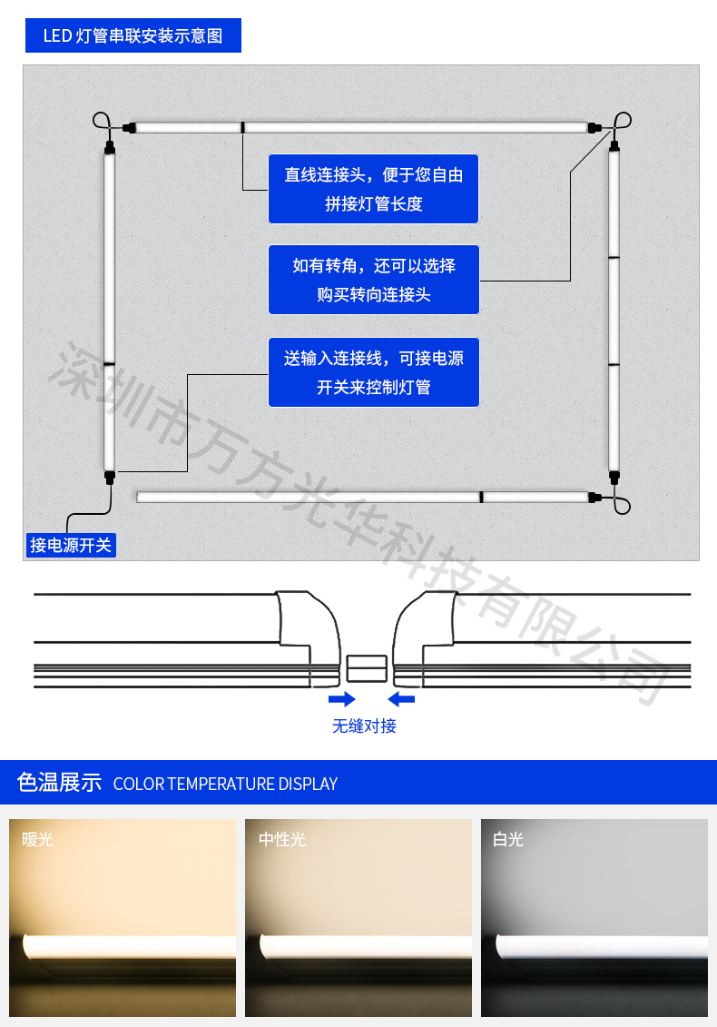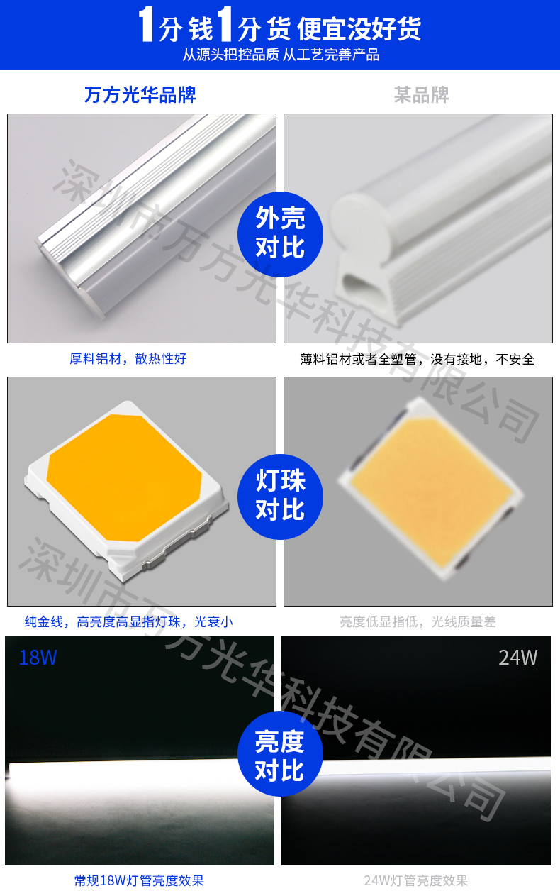 深圳市万方光华科技有限公司,专业研发、生产及销售LED灯管、面板灯,自有工厂,货期快,质量保证,目前已为全球数十万场所提供照明灯具及方案。灯管系列里有t5分体灯管、t5一体灯管、t5一体对接头灯管、t8分体灯管、t8一体灯管、t8转t5灯管、FA8灯管、双光源灯管、v型灯管、感应灯管等,规格款式多样,可按照客户需求定制。