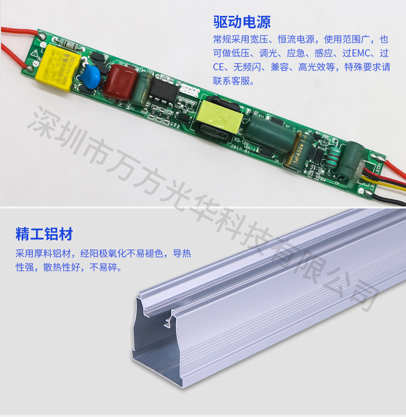 深圳市万方光华科技有限公司,专业研发、生产及销售LED灯管、面板灯,自有工厂,货期快,质量保证,目前已为全球数十万场所提供照明灯具及方案。灯管系列里有t5分体灯管、t5一体灯管、t5一体对接头灯管、t8分体灯管、t8一体灯管、t8转t5灯管、FA8灯管、双光源灯管、v型灯管、感应灯管等,规格款式多样,可按照客户需求定制。