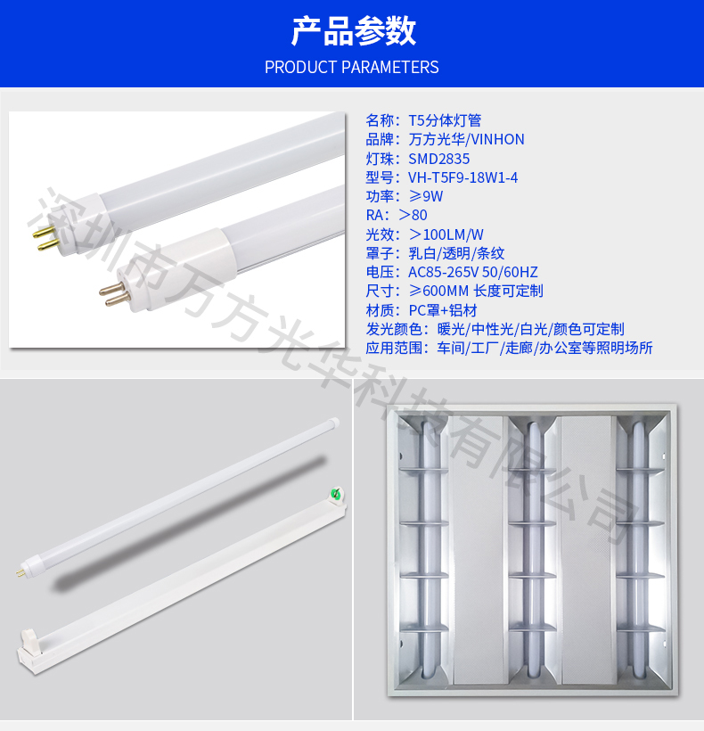 深圳市万方光华科技有限公司,专业研发、生产及销售LED灯管、面板灯,自有工厂,货期快,质量保证,目前已为全球数十万场所提供照明灯具及方案。灯管系列里有t5分体灯管、t5一体灯管、t5一体对接头灯管、t8分体灯管、t8一体灯管、t8转t5灯管、FA8灯管、双光源灯管、v型灯管、感应灯管等,规格款式多样,可按照客户需求定制。