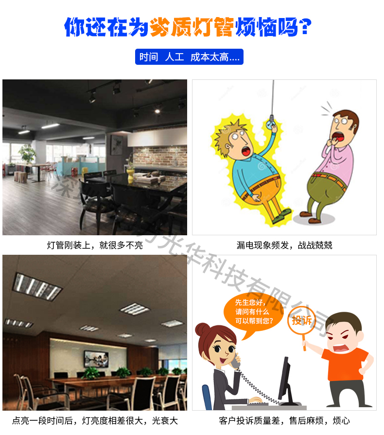 深圳市万方光华科技有限公司,专业研发、生产及销售LED灯管、面板灯,自有工厂,货期快,质量保证,目前已为全球数十万场所提供照明灯具及方案。灯管系列里有t5分体灯管、t5一体灯管、t5一体对接头灯管、t8分体灯管、t8一体灯管、t8转t5灯管、FA8灯管、双光源灯管、v型灯管、感应灯管等,规格款式多样,可按照客户需求定制。