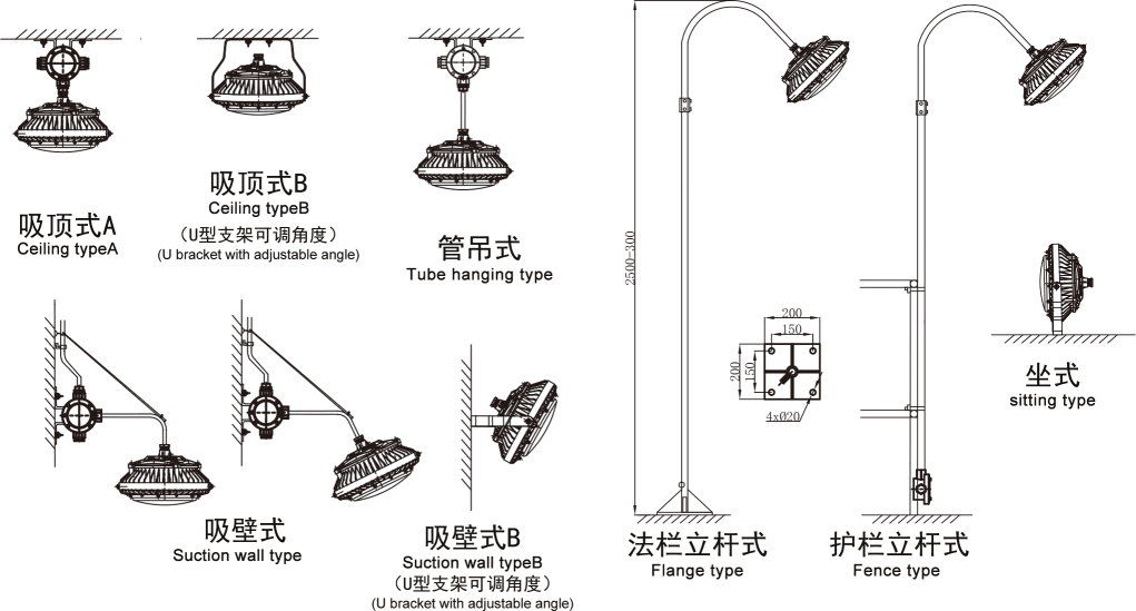 安装方式:A:吸顶式 b:管吊式 c:吸壁式 d:法栏立杆式 e:护栏立杆式