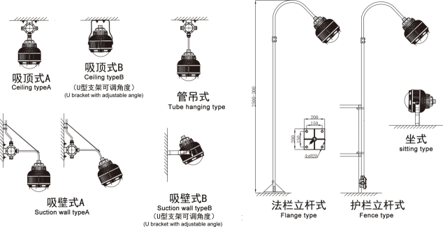 安装方式:A:吸顶式 b:管吊式 c:吸壁式 d:法栏立杆式 e:护栏立杆式