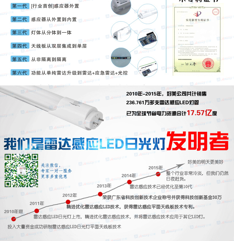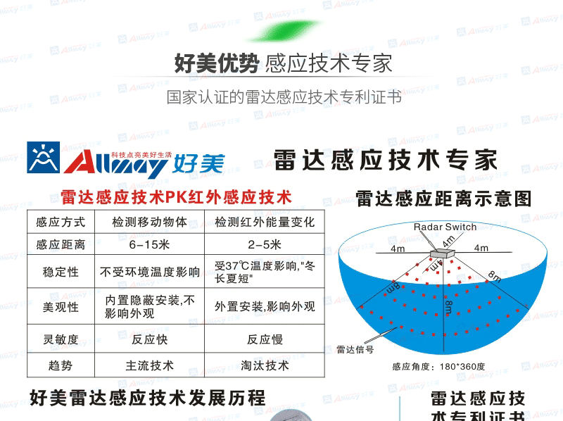 雷达感应LED吸顶灯电源是由中山市好美科技照明有限公司于2011年研究发明的高品质、智能、超节能的一种新型高科技产品。利用多普勒效应原理,自主研发平面天线发射接收电路,智能检测周围电磁环境,自动调整工作状态。从而达到智能省电的效果。被广泛应用于:走廊、楼道、卫生间、地下室、车库、仓库、监控等节能自动照明场所。