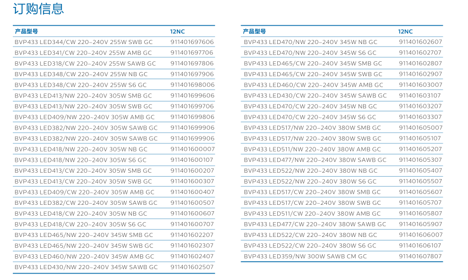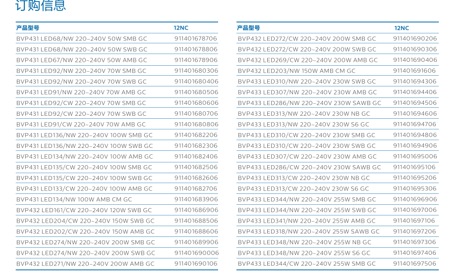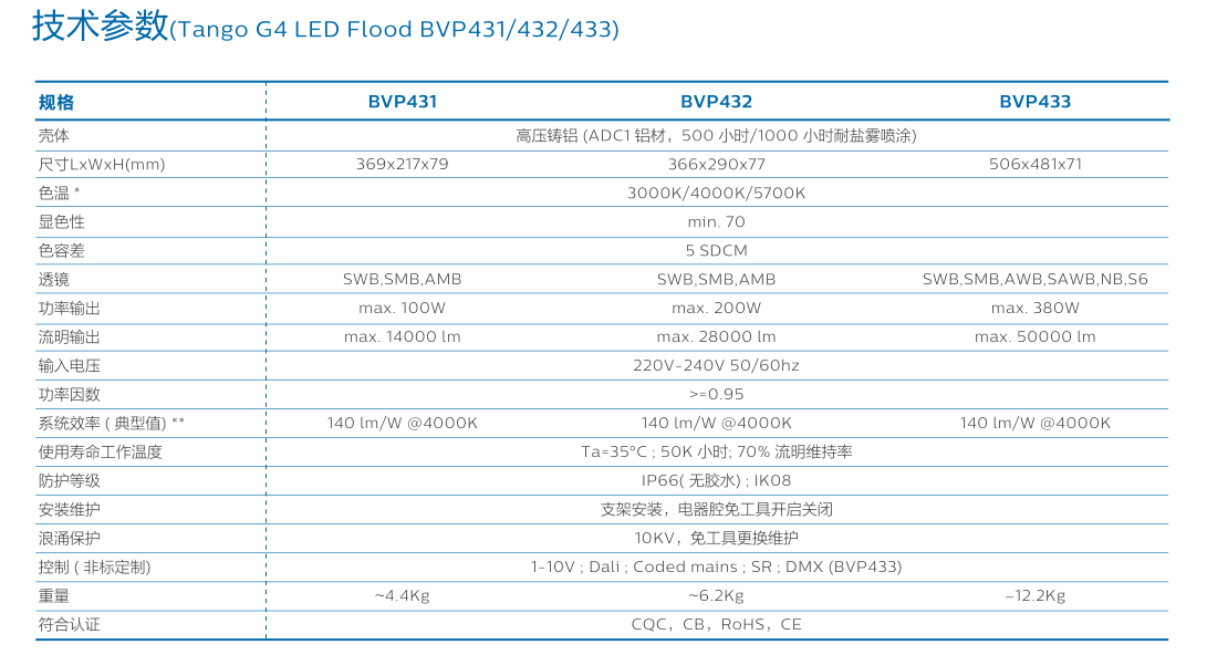 飞利浦Tango G4 BVP433/BVP432系列投光灯,参数: