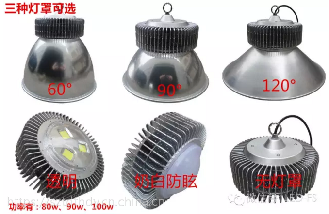 5、配光方式多种,有60度、90度、120度灯罩;同时配备两种PC透光件,透明和奶白防眩透光件