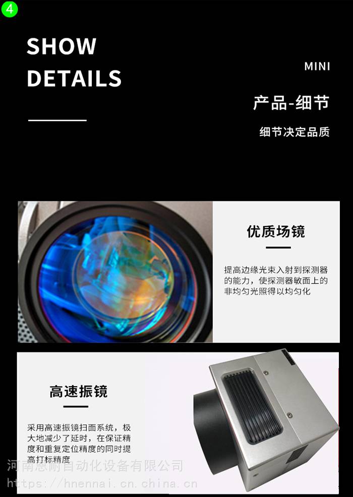 高速扫描振镜:内部核心部件均采用德国先进技术,控制采用数字矢量控制技术,发热少,更静音,打标不飘移。采购双红光控制系统,焦距调整更简单,更快速