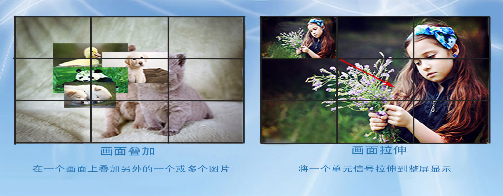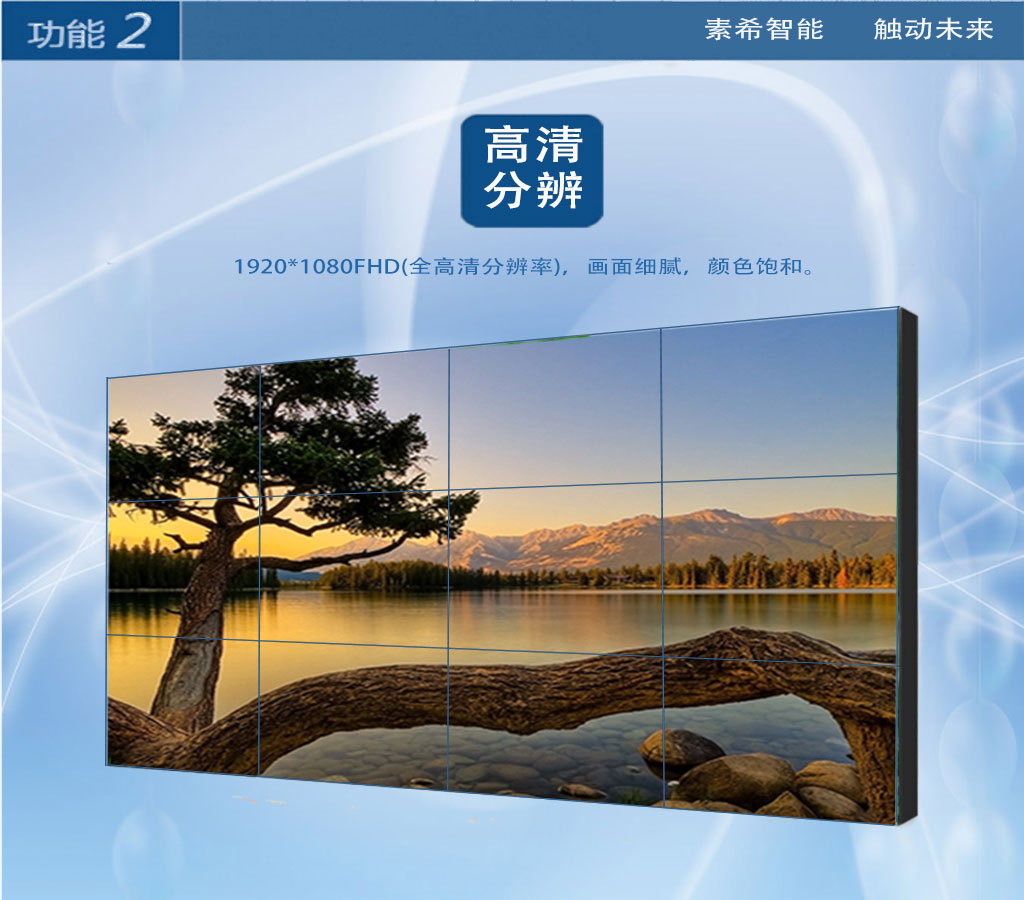 1.产品采用三星DID液晶拼接屏,46寸系列液晶拼接屏拼缝双边仅为3.5mm,采用高分辨率 (1920×1080)、高亮度(500cd/m2和700cd/m2)、高对比度(4000:1)、宽视角(178度)的高清LCD显示面 板,支持1980P全高清数字视频显示。真正为您提供全新的窄边观看体验。多幅全屏、单幅满屏,通过控制软件实现多种显示模式;内置高清底图,虚拟屏技术,可通过图像拼接处理器或矩阵控制系统实 现任意信号的自由大小、叠加、开窗、拉伸、漫游等功能。