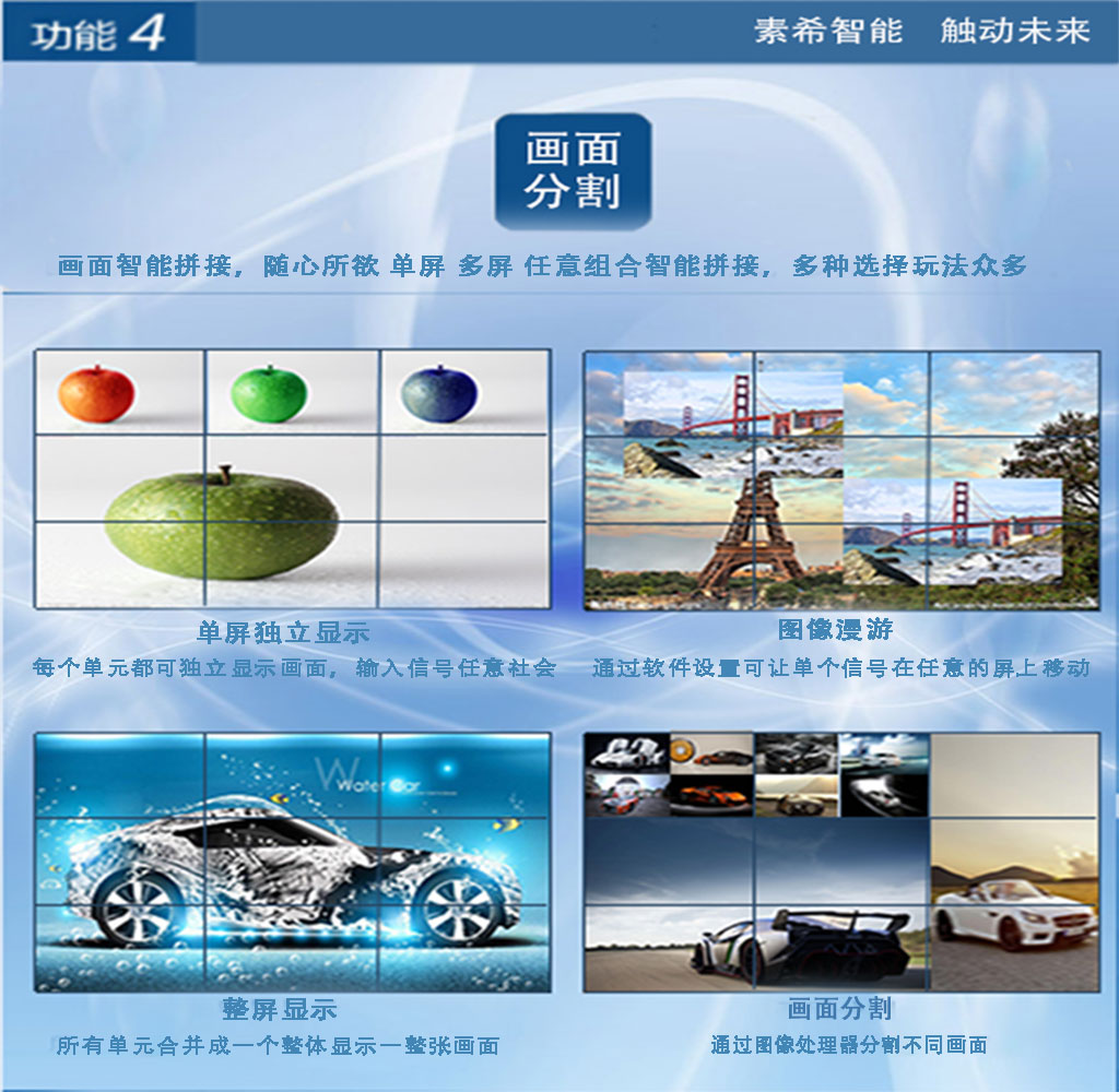 7.可实现手动定时巡航报警预案设定和万花筒演示、智能温控及报警、通讯故障自动检测等功能,多信号分屏显示,整屏显示,任意组合显示。