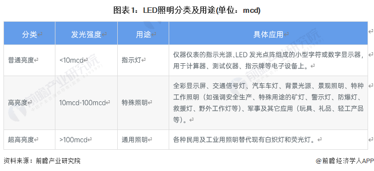 LED照明通常划分为通用照明和特殊照明两大领域。随着LED发光效率和光强的不断提升,LED已经向特殊照明的纵深发展,并逐步进入通用照明领域。LED照明的应用范围主要由LED芯片发光强度(mcd,毫坎德拉)和发光效率(lm/w,流明/瓦)决定。发光强度越大、发光效率越高,则运用越广泛。可将LED芯片按发光强度分为普通亮度LED、高亮度LED和超高亮度LED,发光强度<10mcd为普通亮度,10mcd-100mcd间的为高亮度,达到或超过100mcd的称超高亮度。普通亮度主要用于指示灯;高亮度用于特殊照明;而超高亮度则可以进一步用于通用照明。
