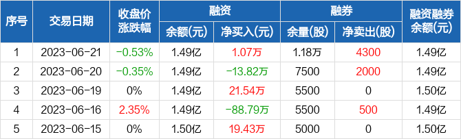 融资方面,当日融资买入154.13万元,融资偿还153.06万元,融资净买入1.07万元。融券方面,融券卖出6300股,融券偿还2000股,融券余量1.18万股,融券余额6.62万元。融资融券余额合计1.49亿元。