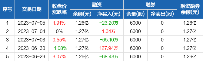 融资方面,当日融资买入294.12万元,融资偿还317.32万元,融资净偿还23.2万元。融券方面,融券卖出0股,融券偿还0股,融券余量6000股,融券余额2.24万元。融资融券余额合计1.26亿元。