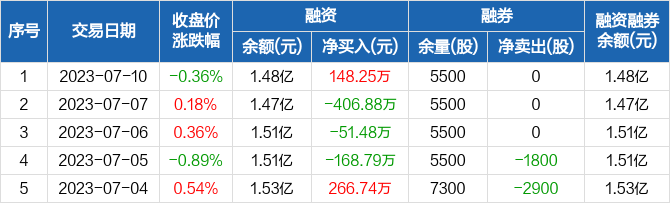 融资方面,当日融资买入189.19万元,融资偿还40.94万元,融资净买入148.25万元。融券方面,融券卖出0股,融券偿还0股,融券余量5500股,融券余额3.07万元。融资融券余额合计1.48亿元。