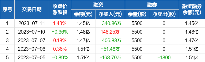 融资方面,当日融资买入109.58万元,融资偿还450.44万元,融资净偿还340.86万元。融券方面,融券卖出0股,融券偿还0股,融券余量5500股,融券余额3.11万元。融资融券余额合计1.45亿元。