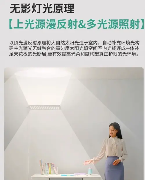 这款反射光护眼落地灯采用了定向间接光倒置光源照明灯具的设计,通过革命性的发光、出光和控光技术,为高端空间照明设计带来了突破性的效果。其独特的光学设计能够有效减少眩光和蓝光辐射,保护用户的眼睛健康。